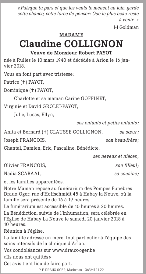 Décédée à Arlon (6700) le mardi 16 janvier 2018 à l'âge de 77 ans
