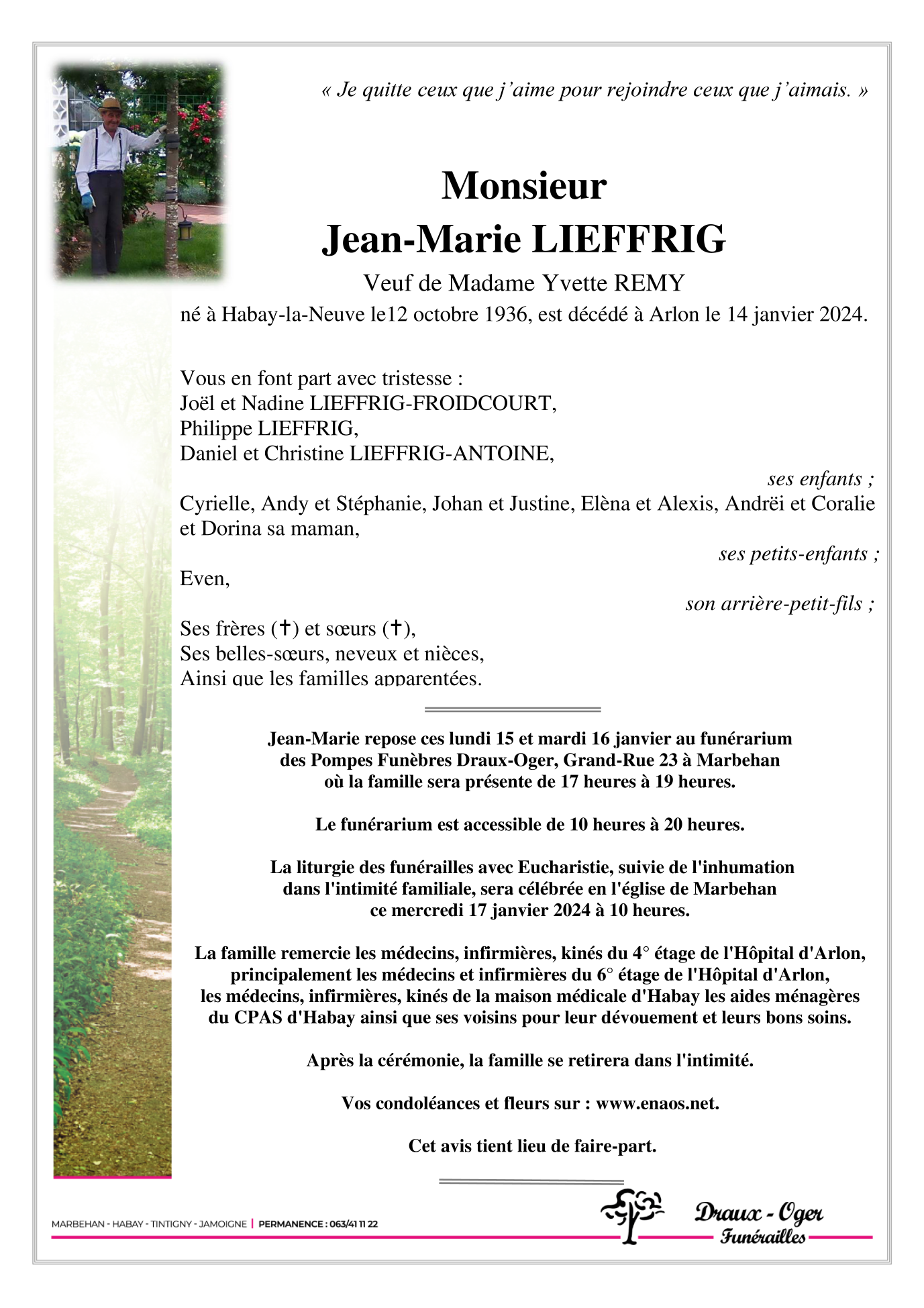 Décédé à Arlon (6700) le dimanche 14 janvier 2024 à l'âge de 87 ans