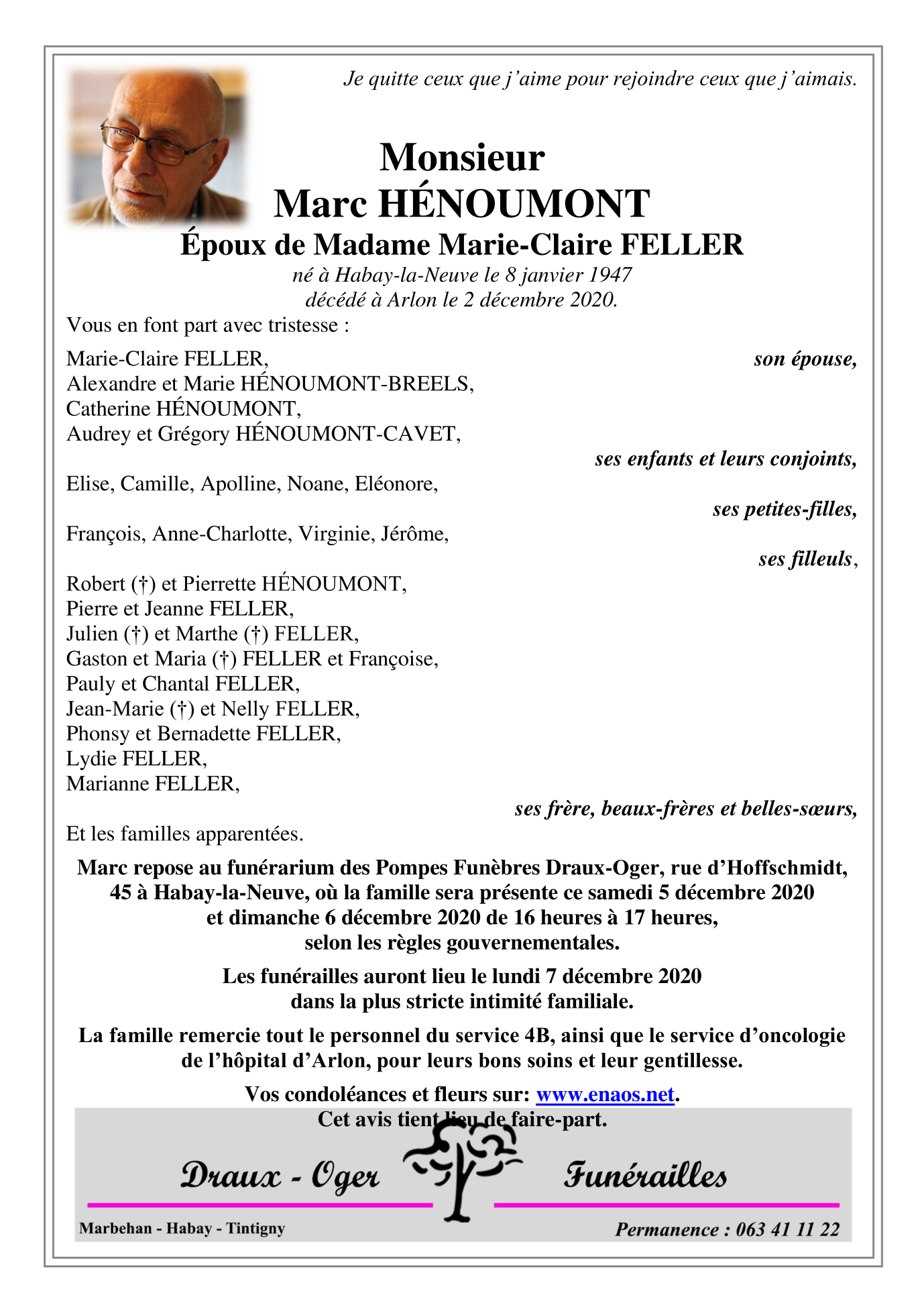 Décédé à Arlon (6700) le mercredi 2 décembre 2020 à l'âge de 73 ans