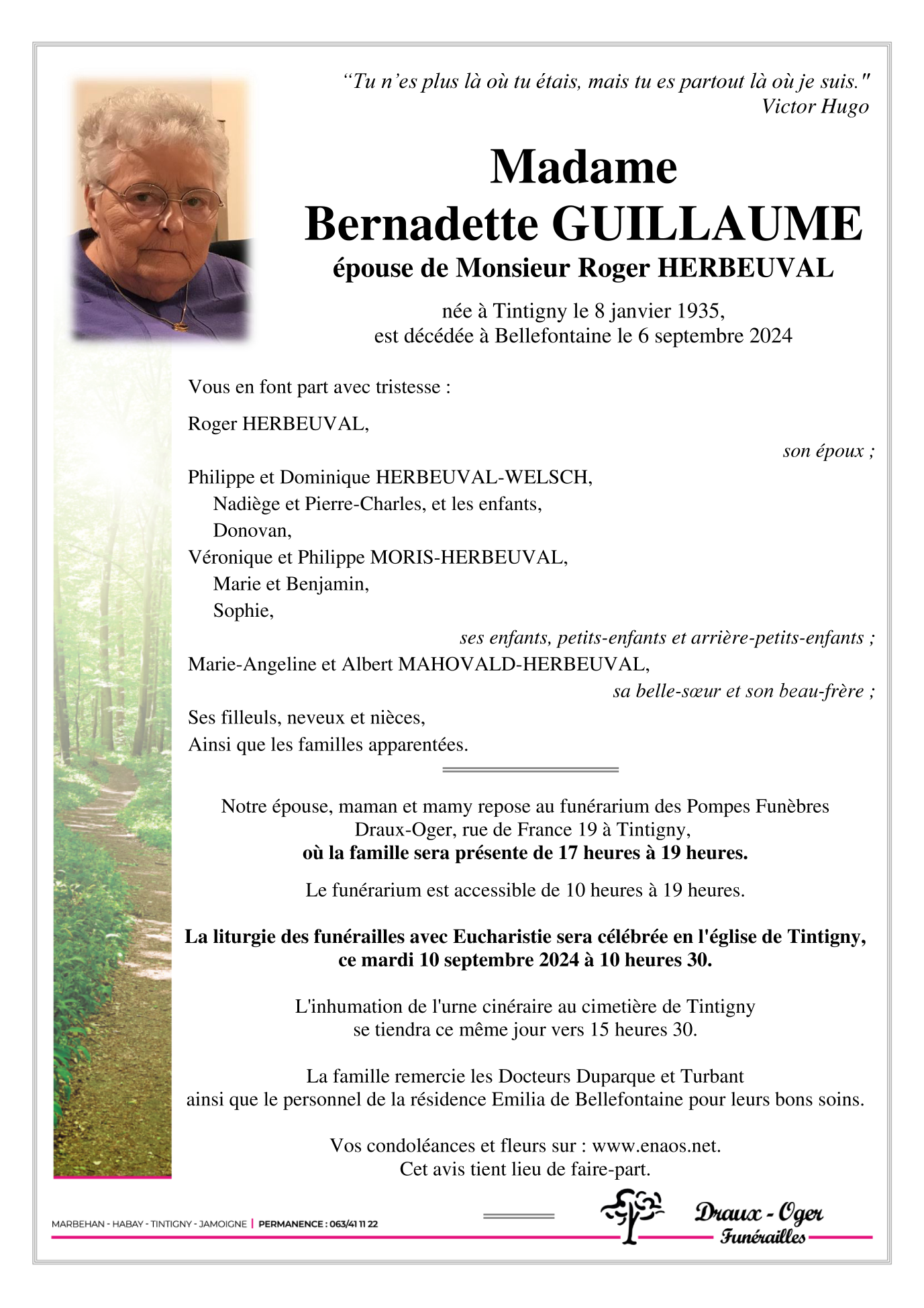 Décédée à Bellefontaine (Lux.) (6730) le vendredi 6 septembre 2024 à l'âge de 89 ans