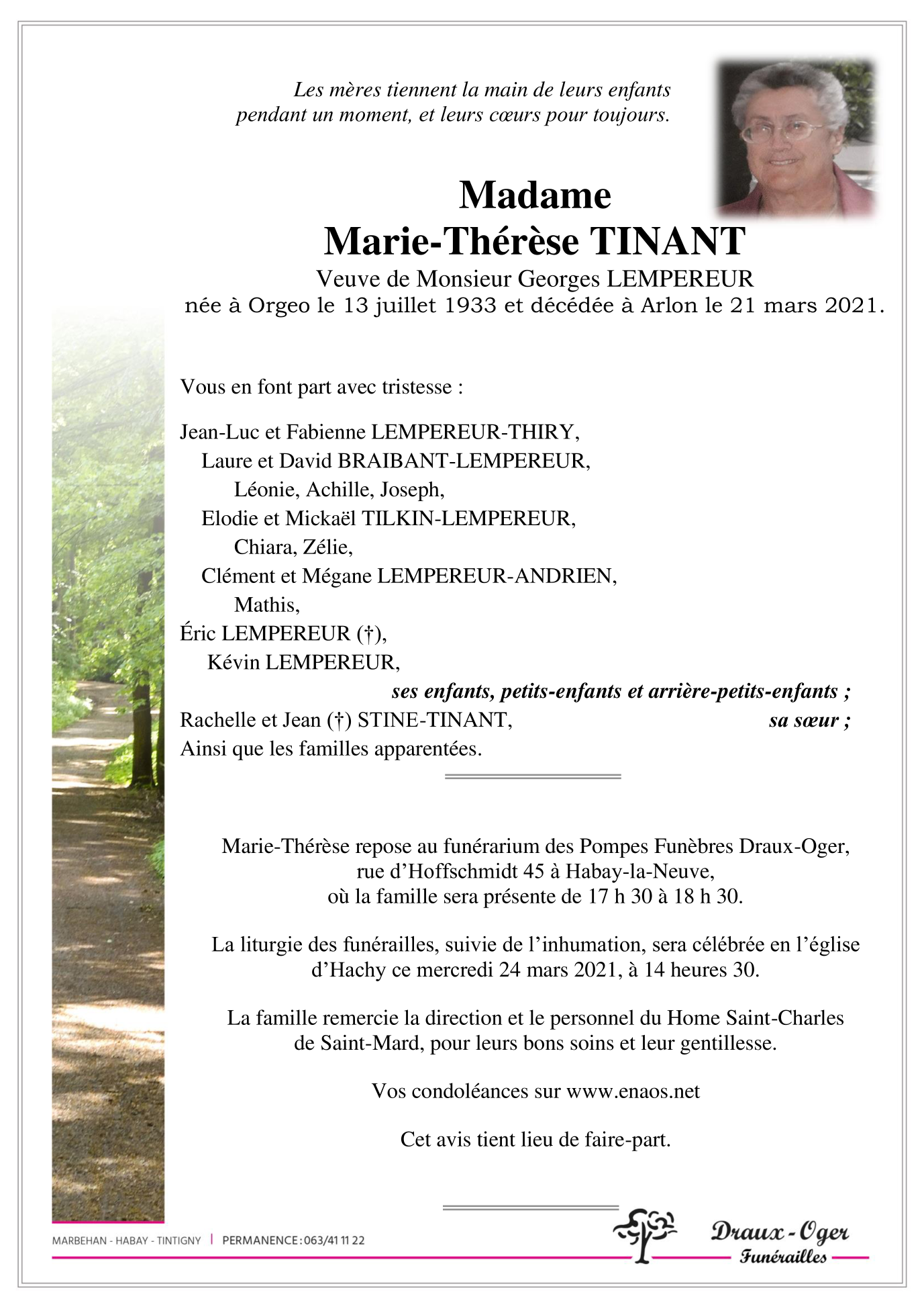 Décédée à Arlon (6700) le dimanche 21 mars 2021 à l'âge de 87 ans