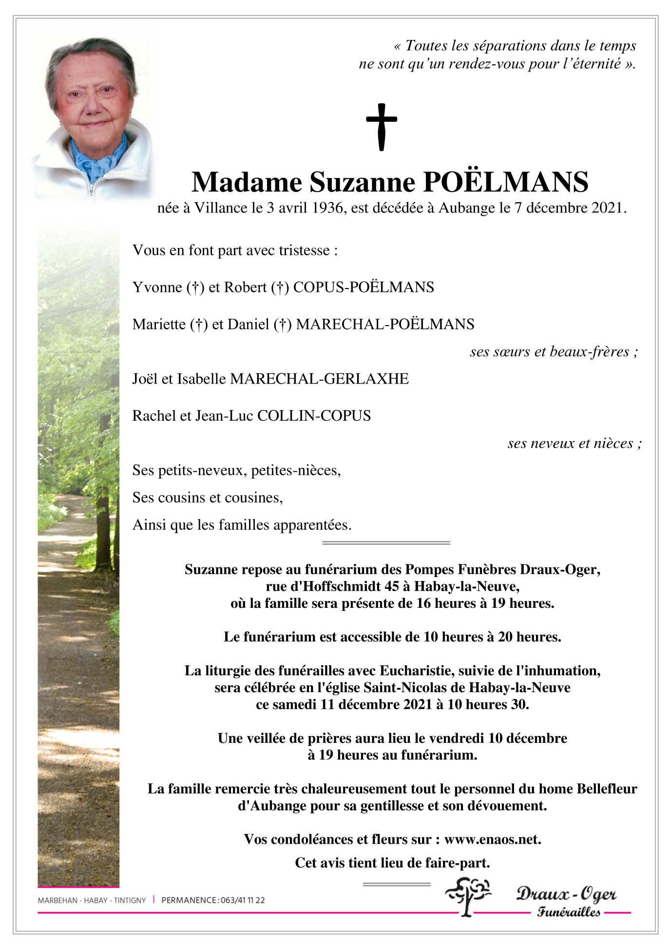 Décédée à Aubange (6790) le mardi 7 décembre 2021 à l'âge de 85 ans
