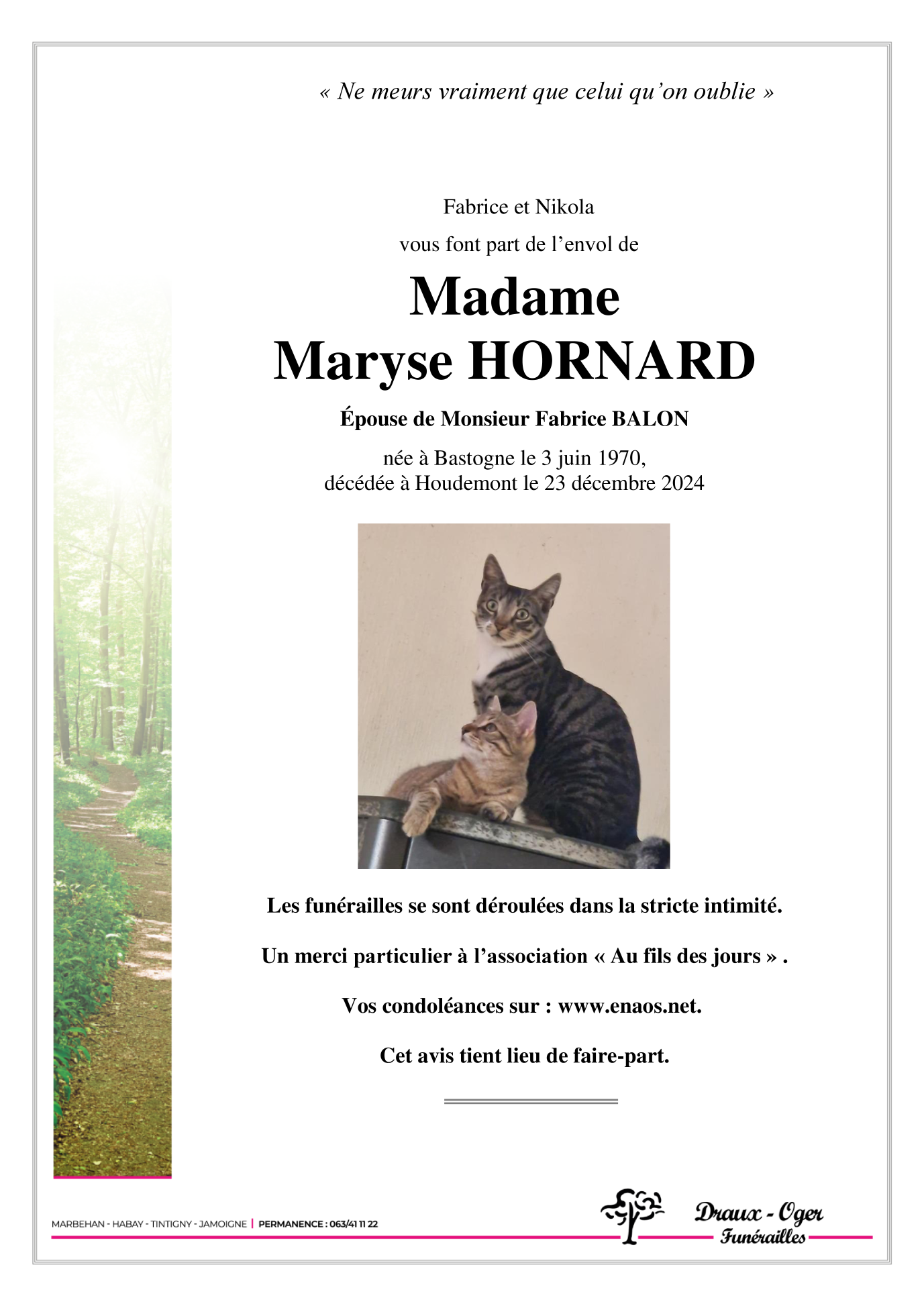 Décédée à Houdemont (6724) le lundi 23 décembre 2024 à l'âge de 54 ans