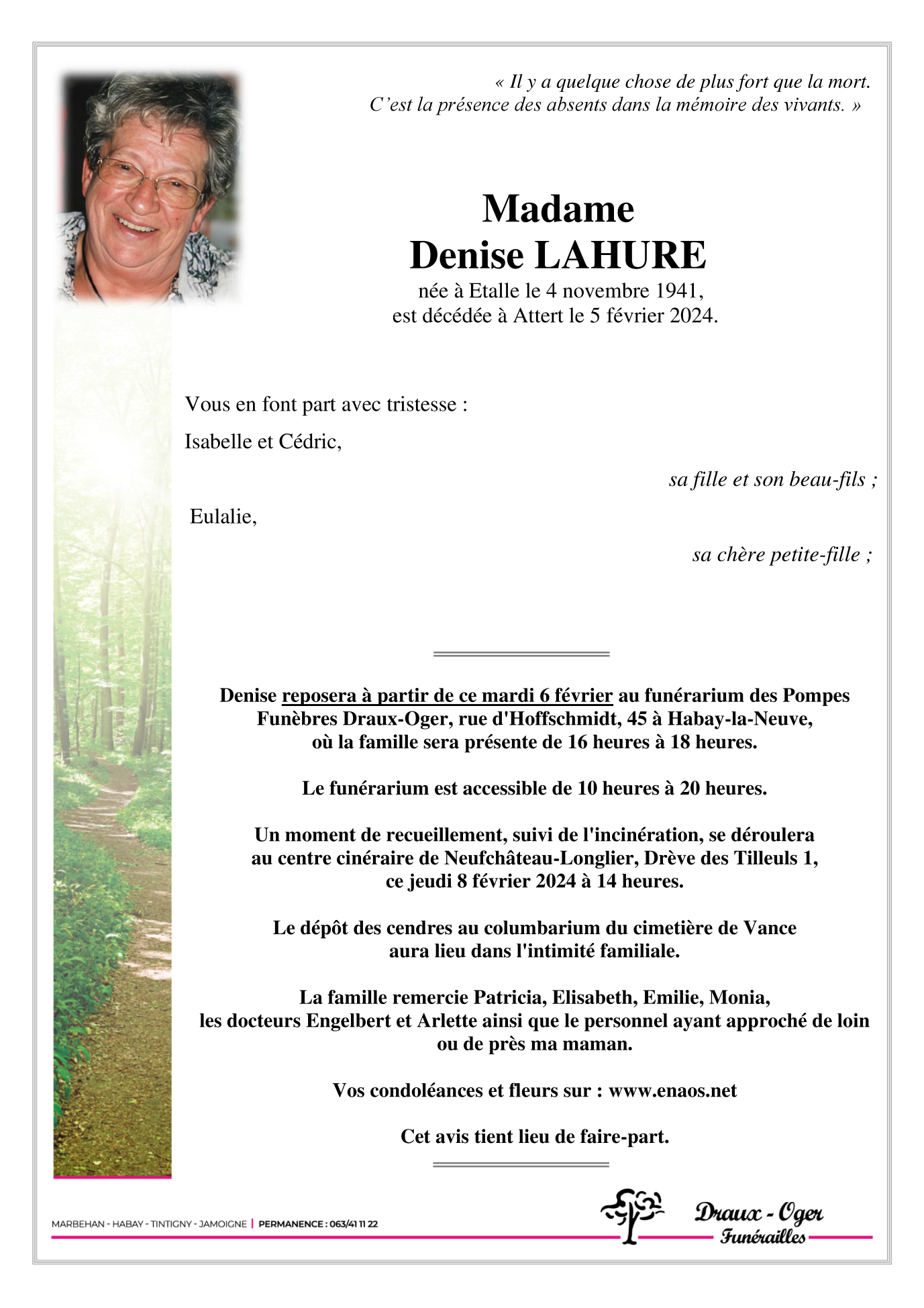 Décédée à Attert (6717) le lundi 5 février 2024 à l'âge de 82 ans