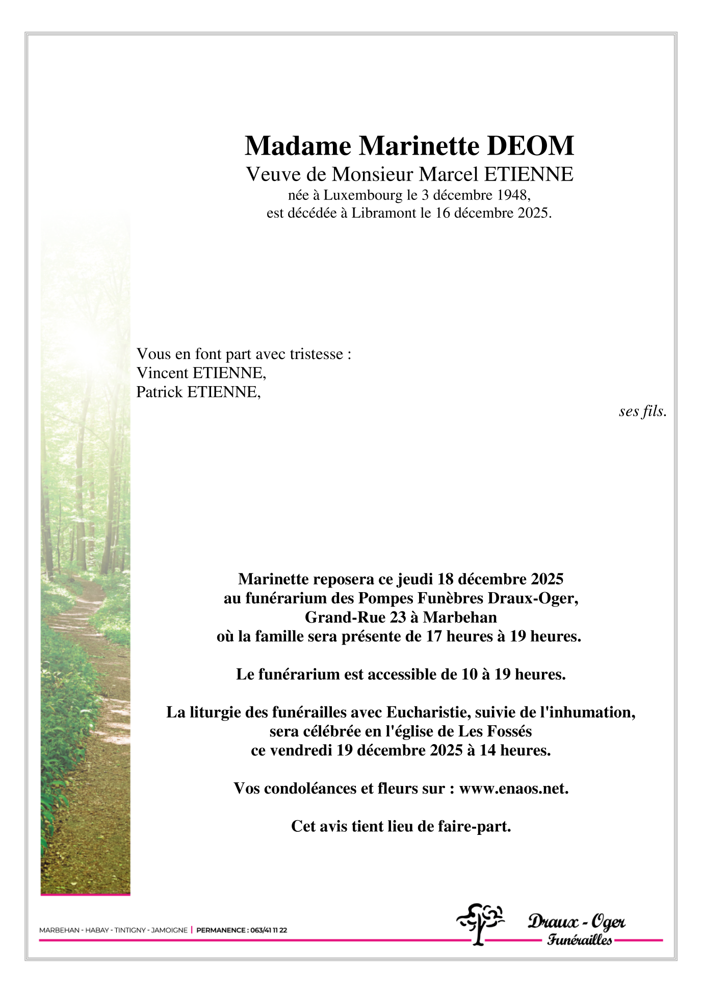 Décédée à Libramont-Chevigny (6800) le mardi 16 décembre 2025 à l'âge de 77 ans