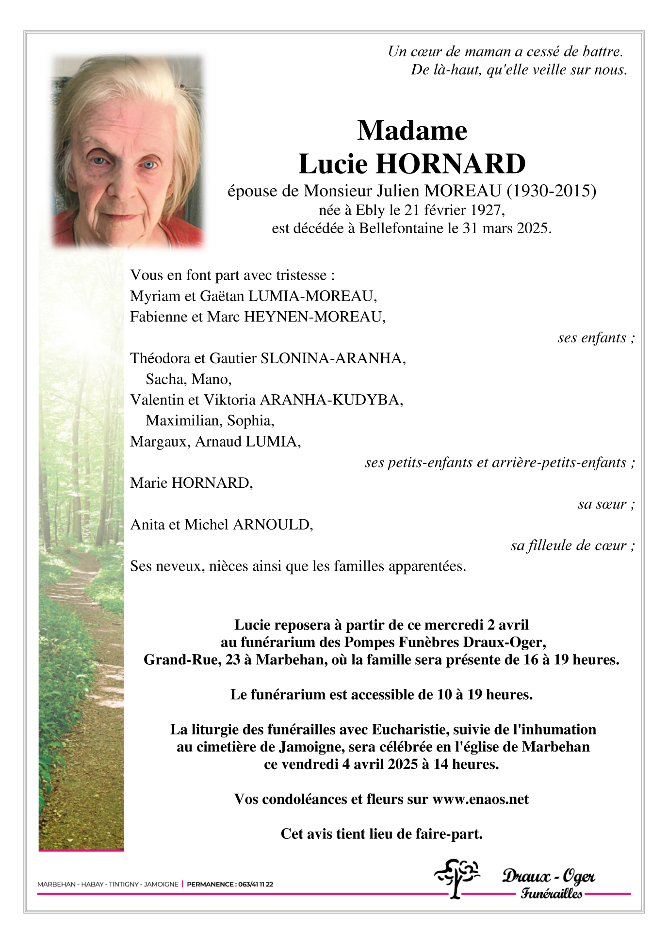 Décédée à Bellefontaine (Lux.) (6730) le lundi 31 mars 2025 à l'âge de 98 ans