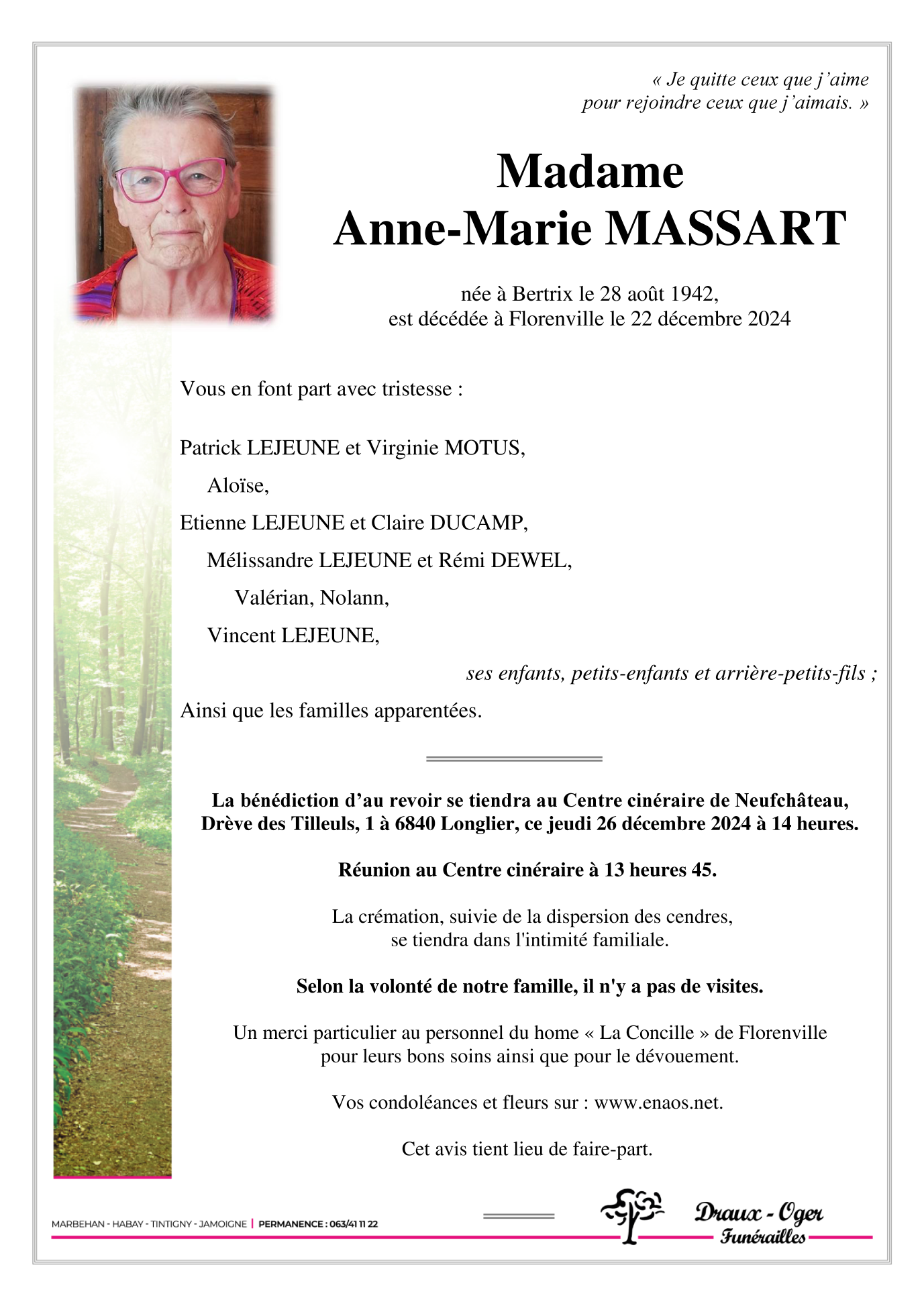 Décédée à Florenville (6820) le dimanche 22 décembre 2024 à l'âge de 82 ans