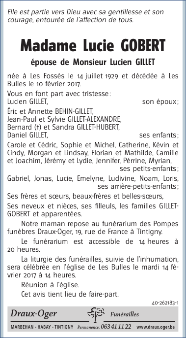 Décédée à Les Bulles (6811) le vendredi 10 février 2017 à l'âge de 87 ans