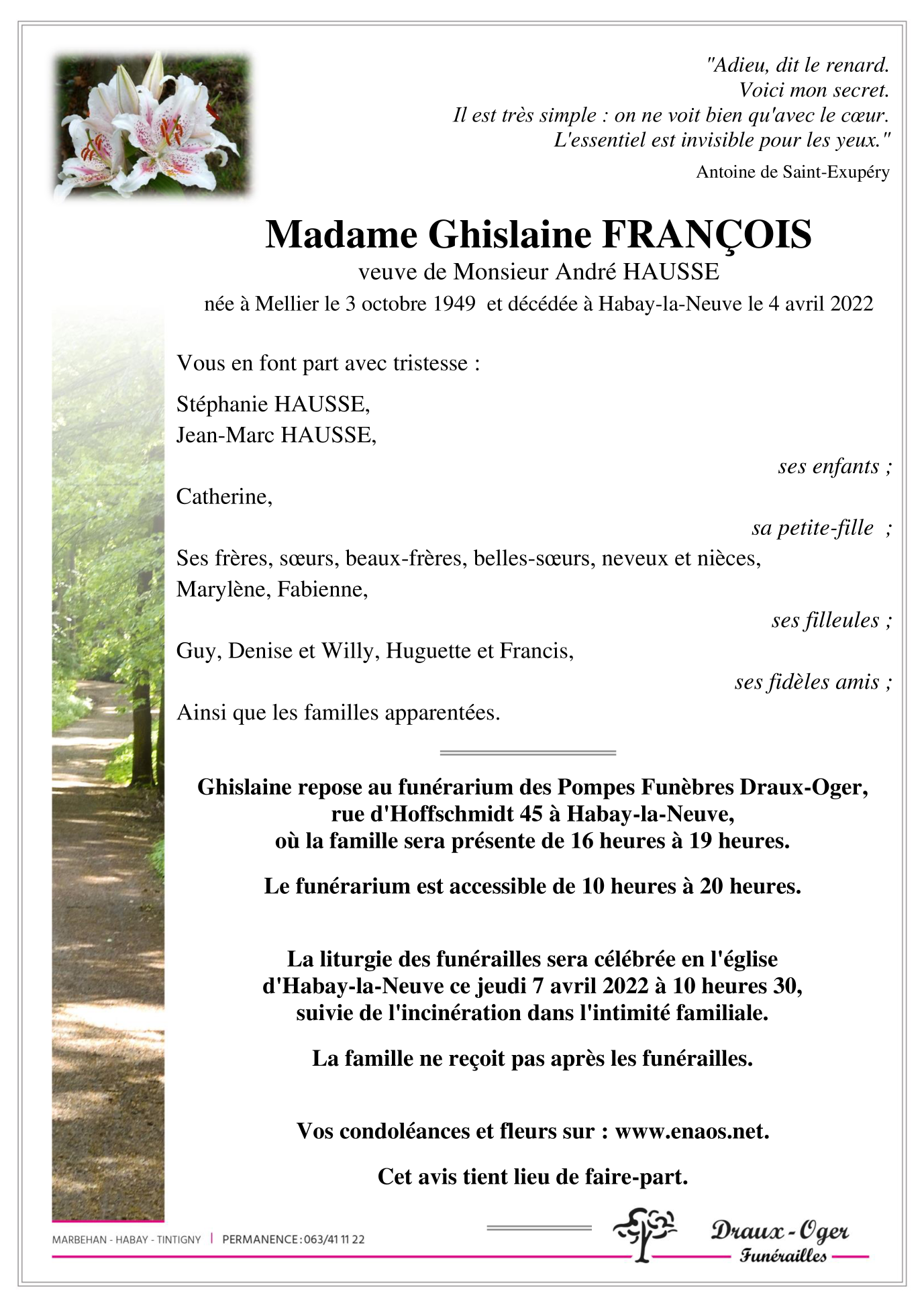 Décédée à Habay-la-Neuve (6720) le lundi 4 avril 2022 à l'âge de 72 ans