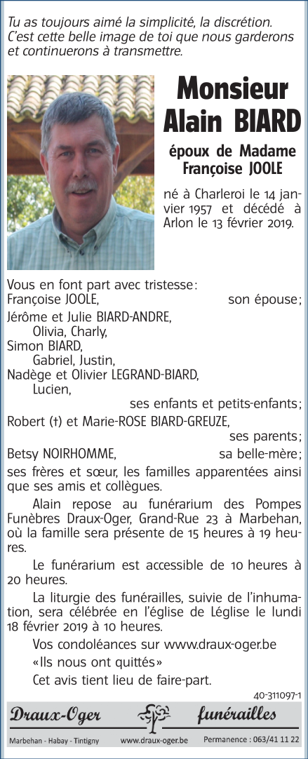 Décédé à Arlon (6700) le mercredi 13 février 2019 à l'âge de 62 ans