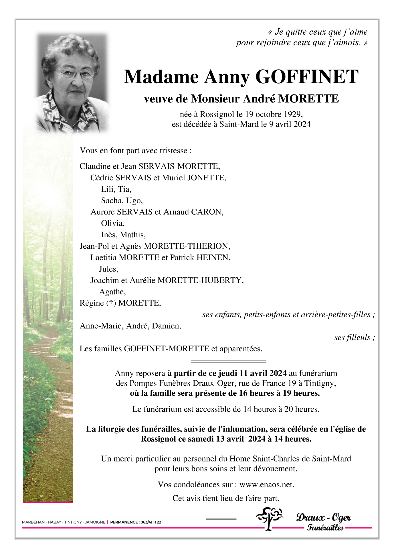 Décédée à Saint-Mard (6762) le mardi 9 avril 2024 à l'âge de 94 ans