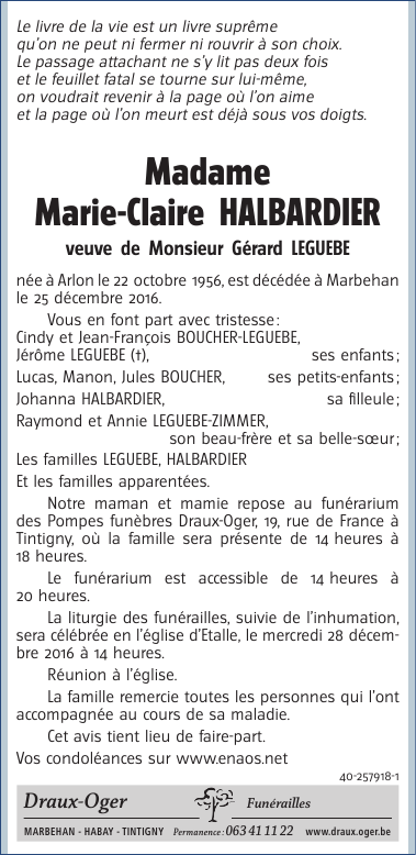 Décédée à Marbehan (6724) le dimanche 25 décembre 2016 à l'âge de 60 ans