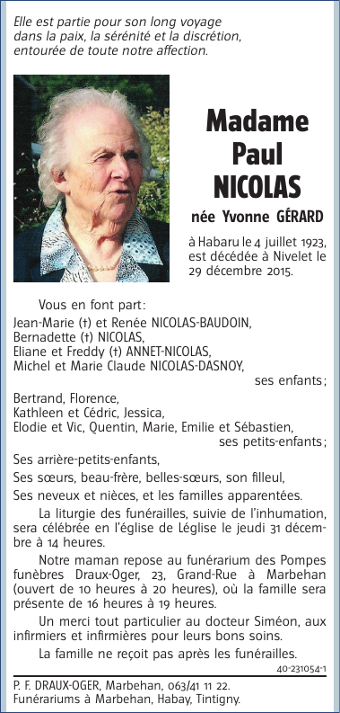 Décédée à Nivelet (6860) le mardi 29 décembre 2015 à l'âge de 92 ans