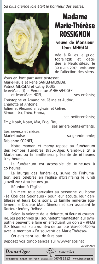 Décédée à Neufchâteau (6840) le jeudi 30 mars 2017 à l'âge de 91 ans