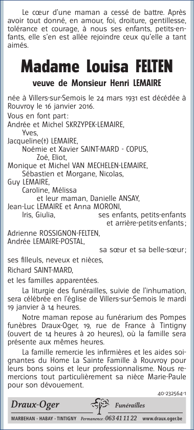 Décédée à Rouvroy (6767) le samedi 16 janvier 2016 à l'âge de 84 ans