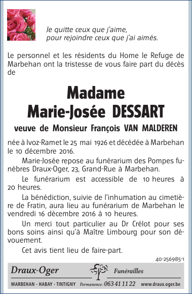 Décédée à Marbehan (6724) le samedi 10 décembre 2016 à l'âge de 90 ans