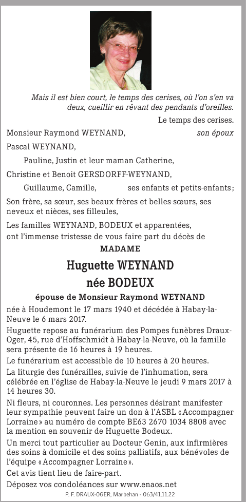 Madame Huguette WEYNAND née BODEUX