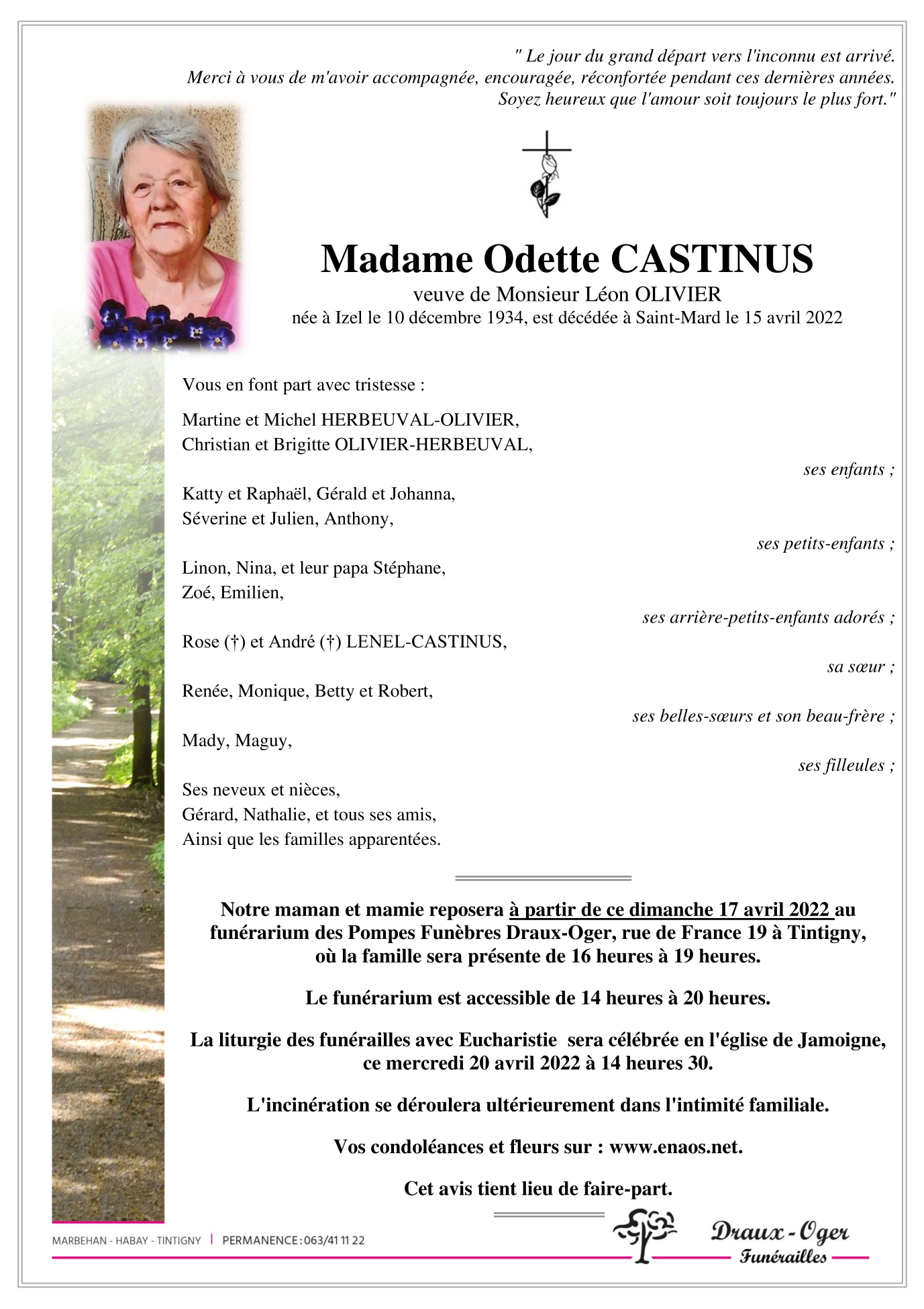 Décédée à Saint-Mard (6762) le vendredi 15 avril 2022 à l'âge de 87 ans