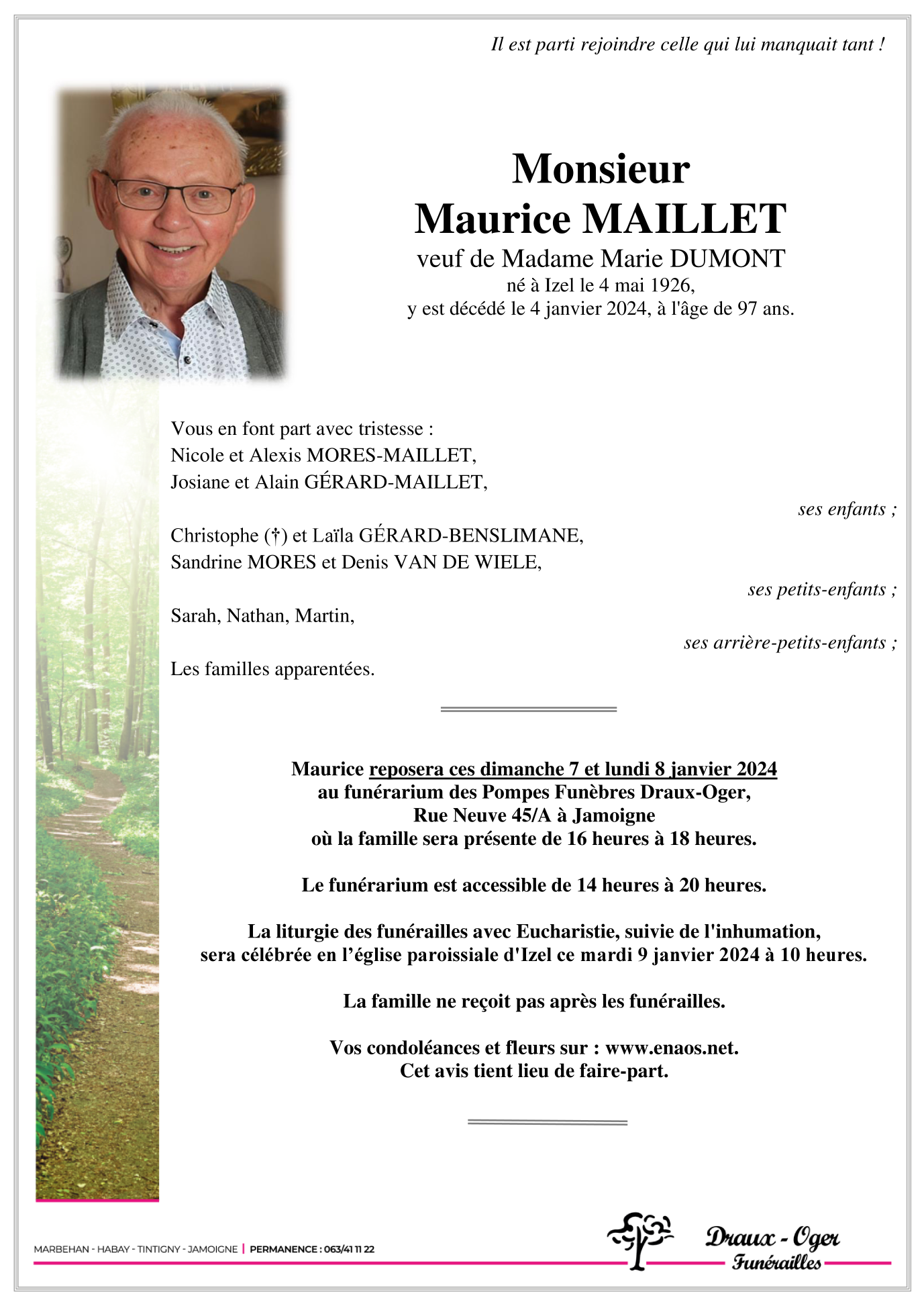 Décédé à Izel (6810) le jeudi 4 janvier 2024 à l'âge de 97 ans