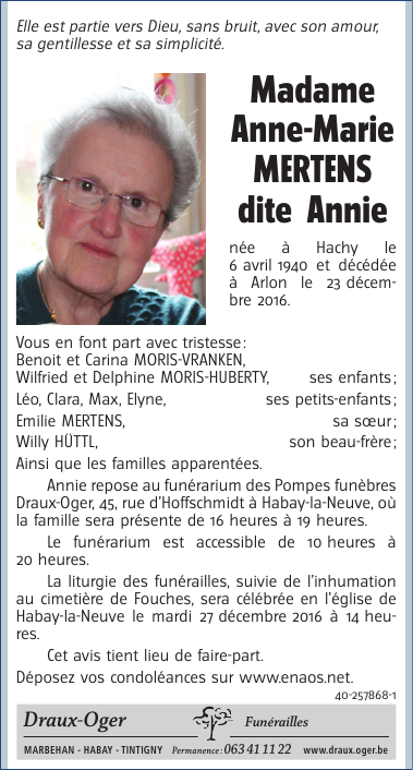Décédée à Arlon (6700) le vendredi 23 décembre 2016 à l'âge de 76 ans
