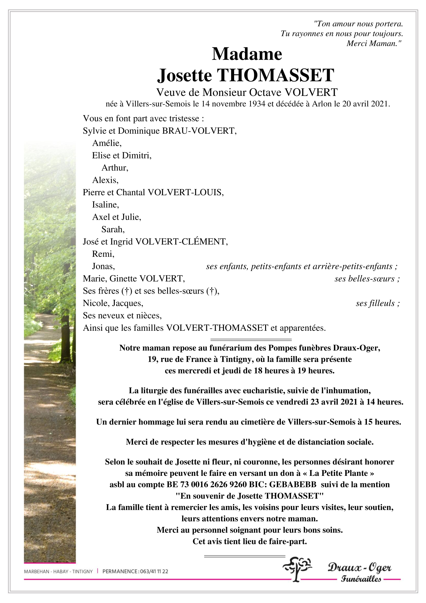 Décédée à Arlon (6700) le mardi 20 avril 2021 à l'âge de 86 ans