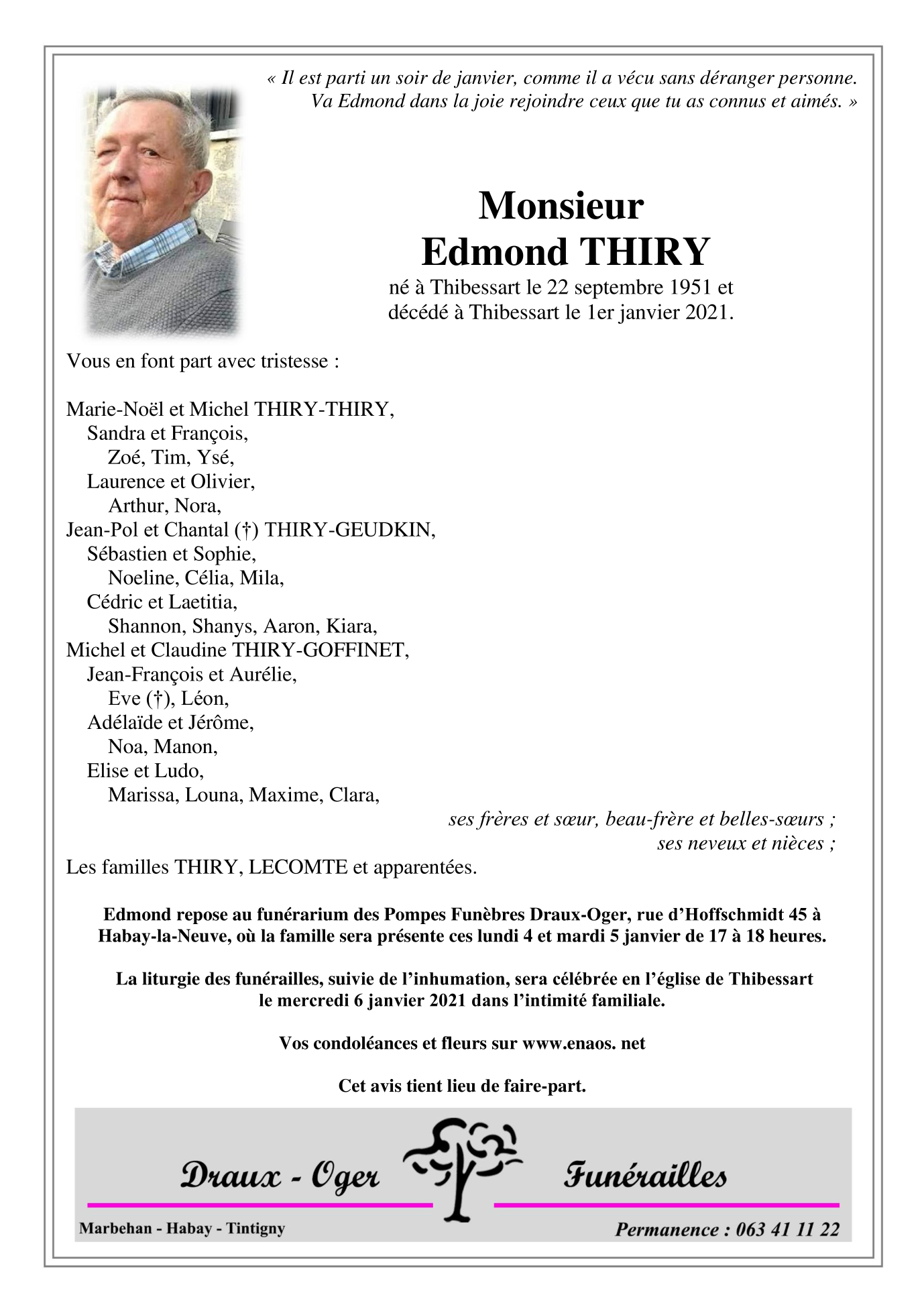 Décédé à Thibessart (6860) le vendredi 1 janvier 2021 à l'âge de 69 ans