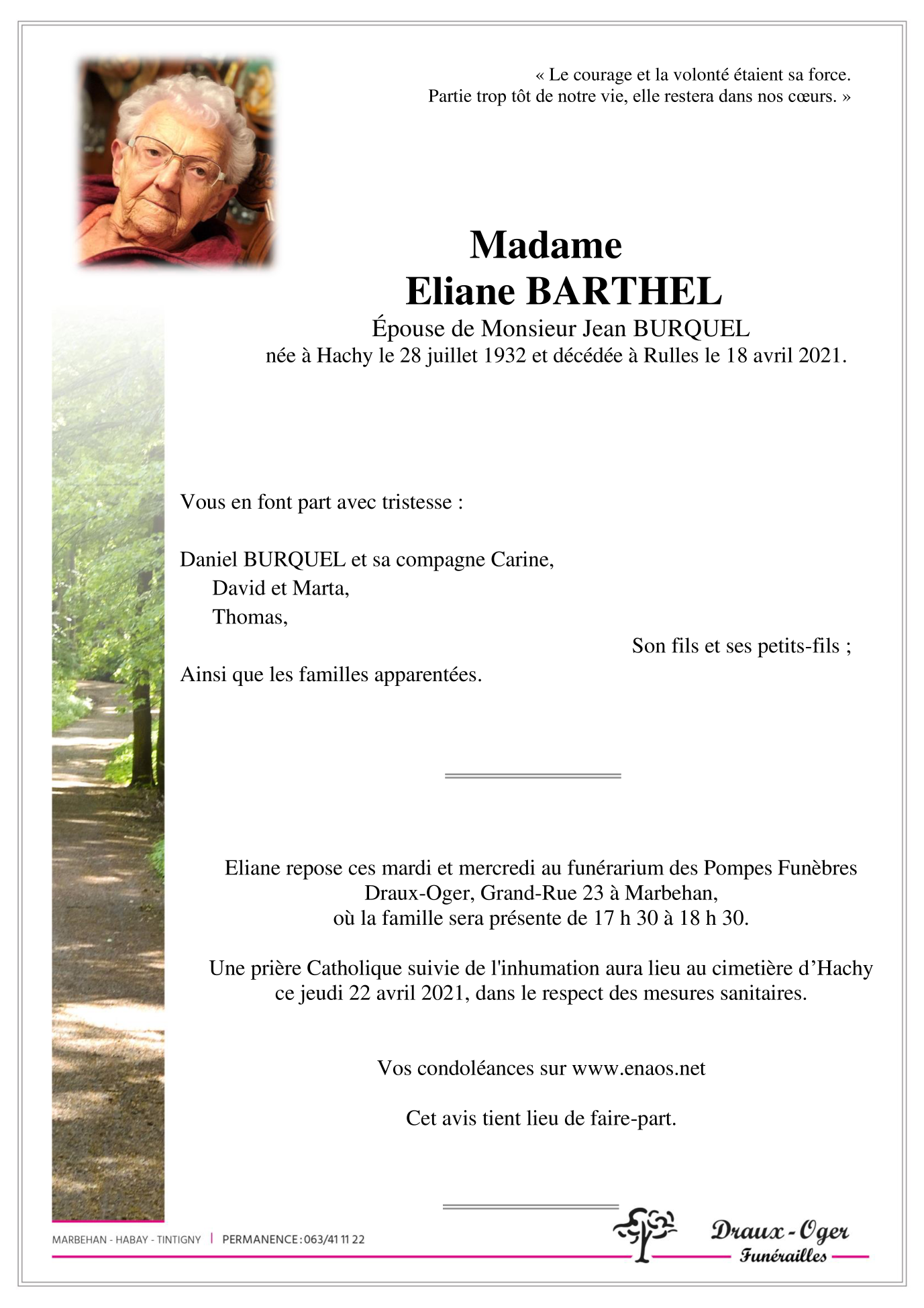 Décédée à Rulles (6724) le dimanche 18 avril 2021 à l'âge de 88 ans