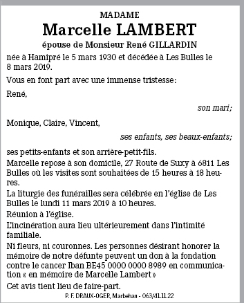 Décédée à Les Bulles (6811) le vendredi 8 mars 2019 à l'âge de 89 ans