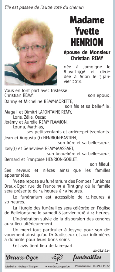 Décédée à Arlon (6700) le mercredi 3 janvier 2018 à l'âge de 81 ans