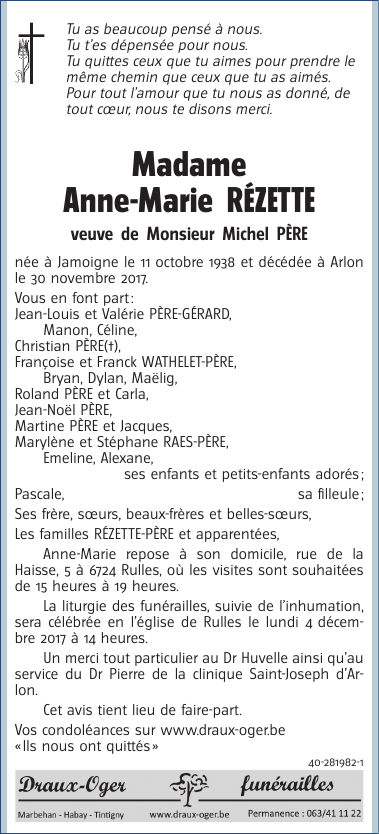 Décédée à Arlon (6700) le jeudi 30 novembre 2017 à l'âge de 79 ans