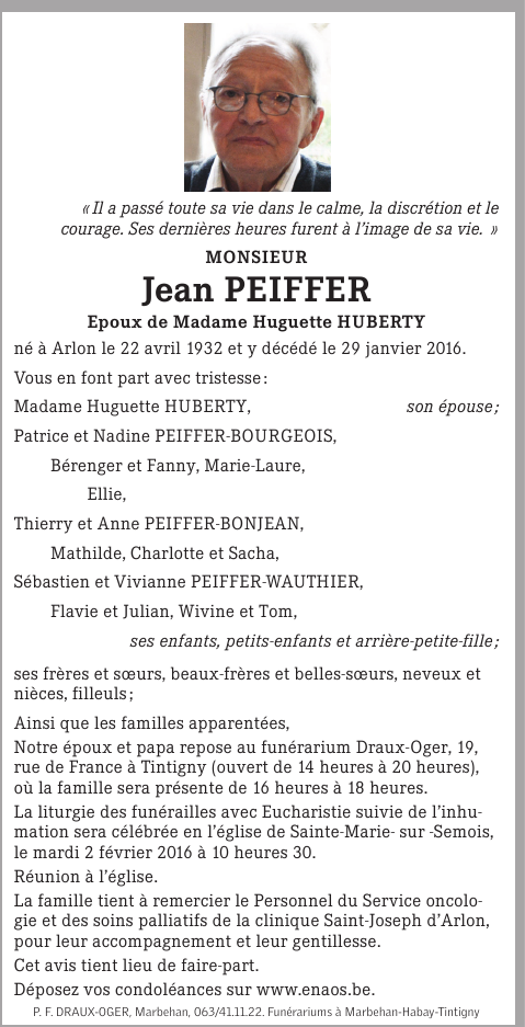 Décédé à Arlon (6700) le vendredi 29 janvier 2016 à l'âge de 83 ans
